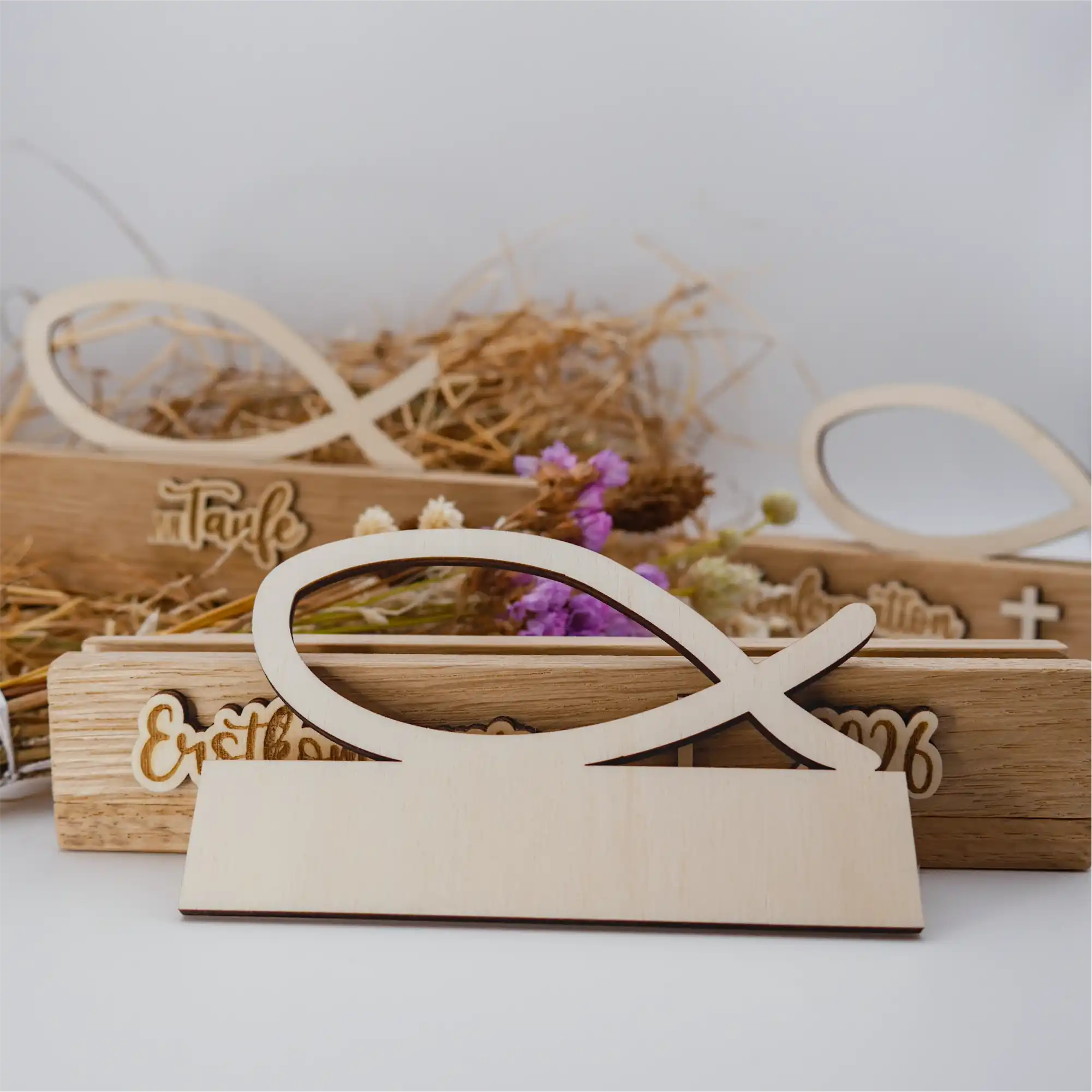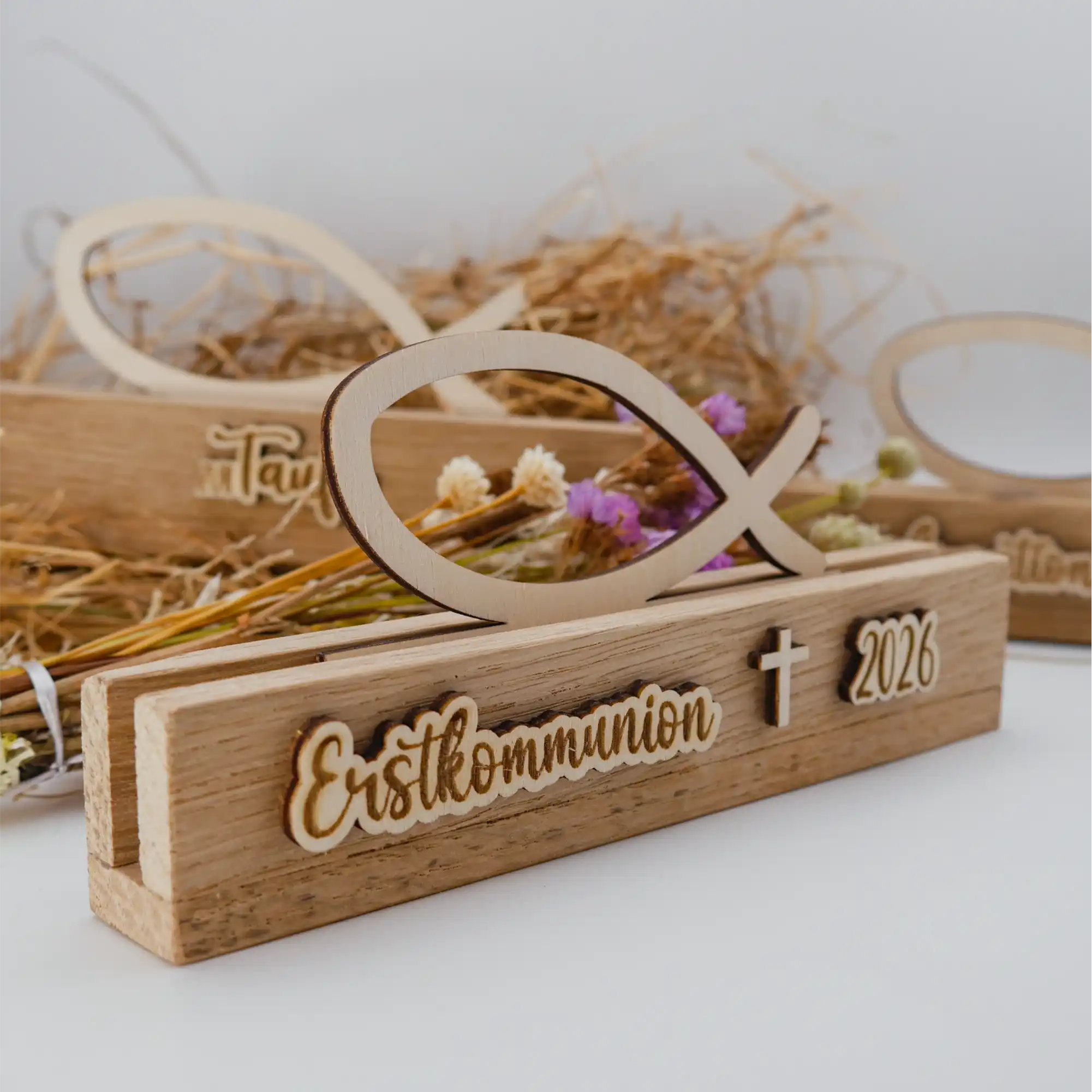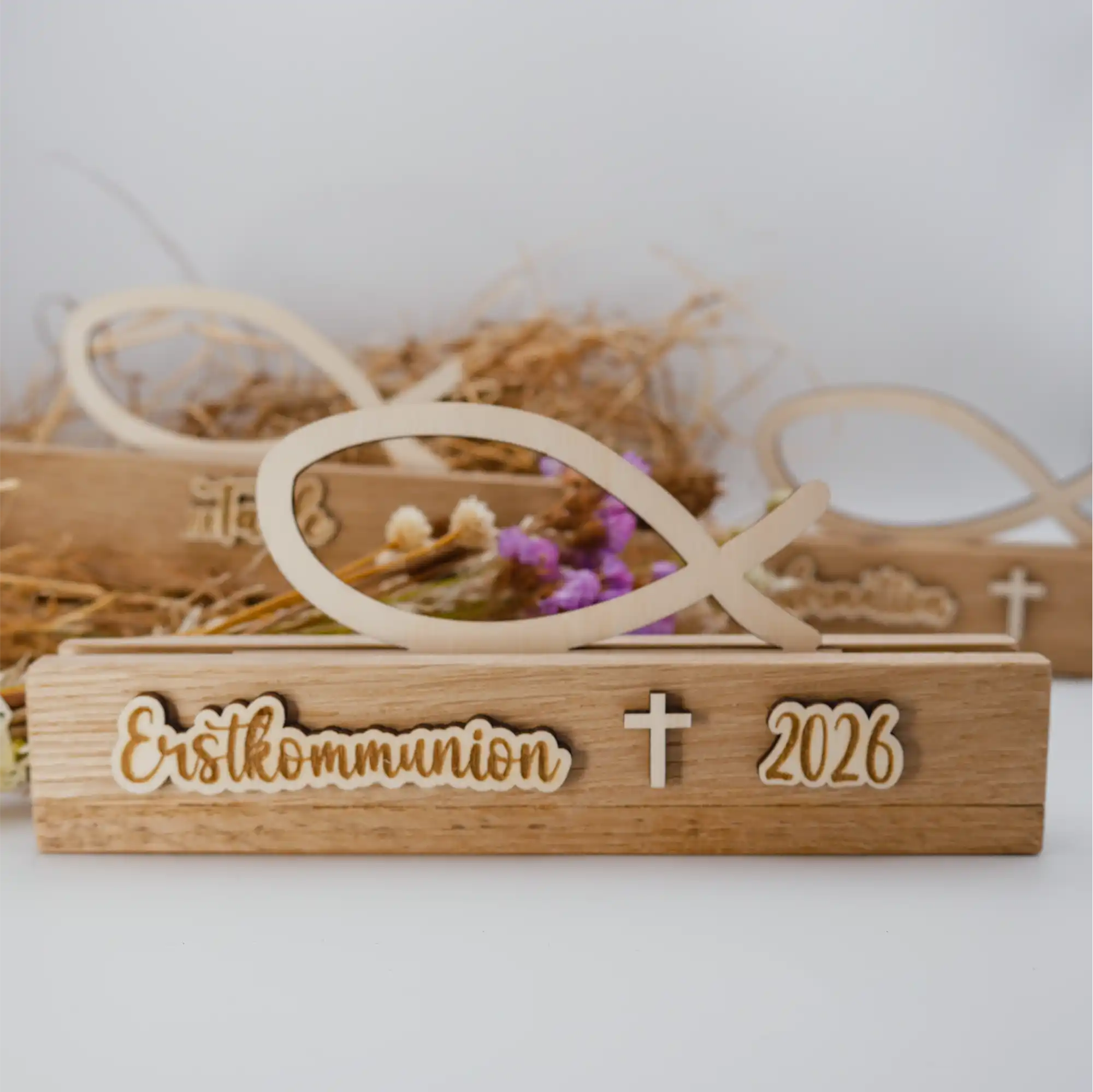- zweiteiliges Set mit einem Holzständer mit dem Wort „Kommunion“, Kreuz und der Jahreszahl als gelaserte Holzelemente, sowie einen gelaserten Einstecker in Fischform.