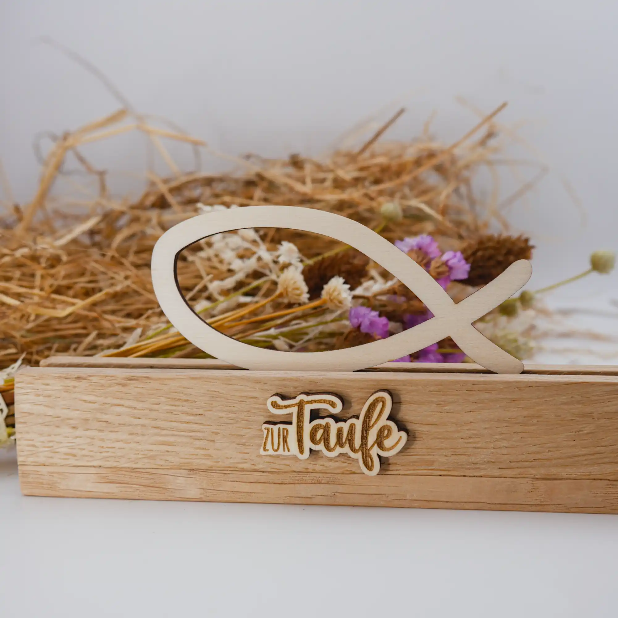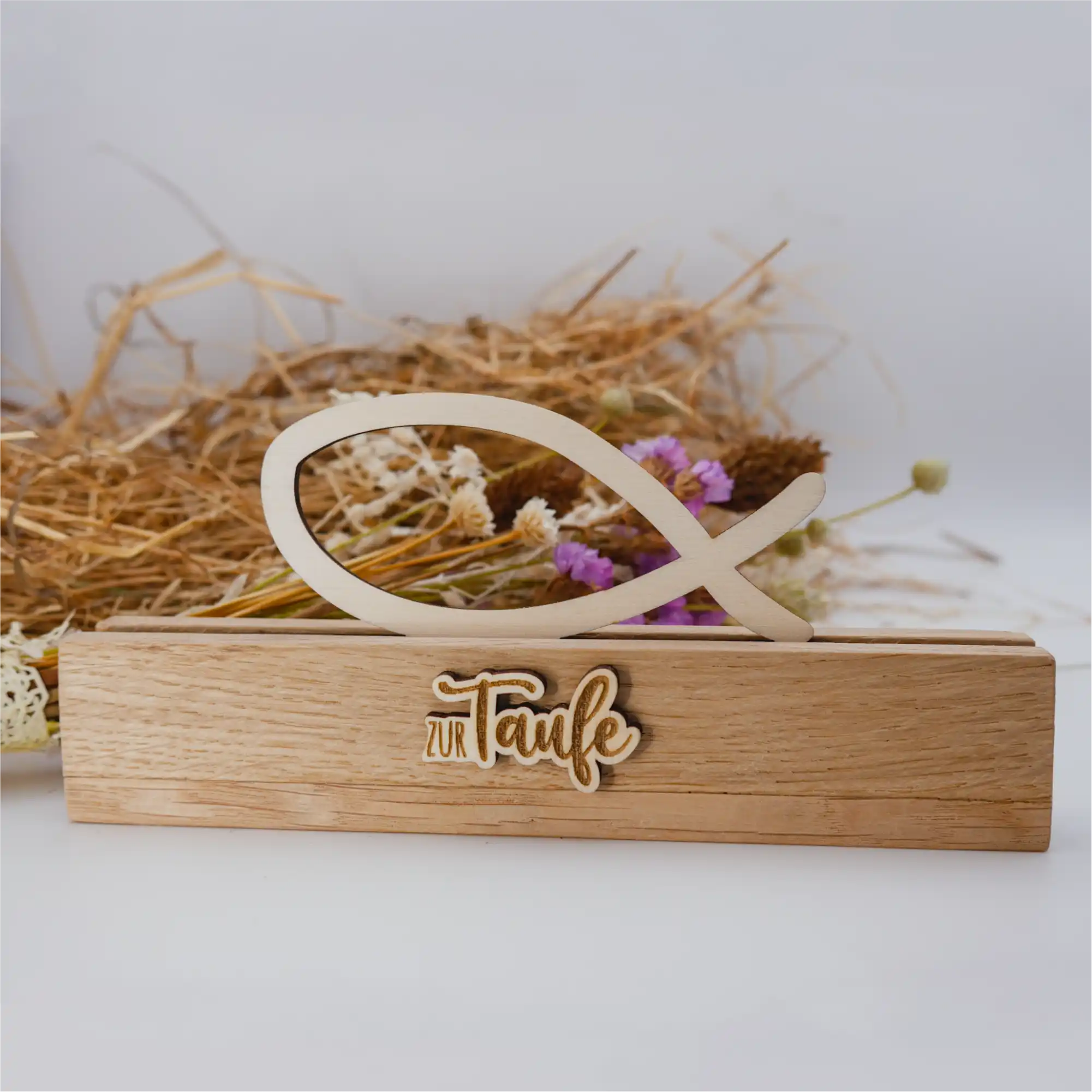 - zweiteiliges Set mit einem Holzständer mit dem Wort „Taufe“ sowie einen gelaserten Einstecker in Fischform.